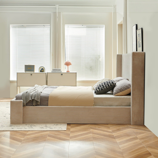 Lit Adulte Japandi 160x200 cm Tête de Lit Matelassée Velours Côtelé Beige – Frida