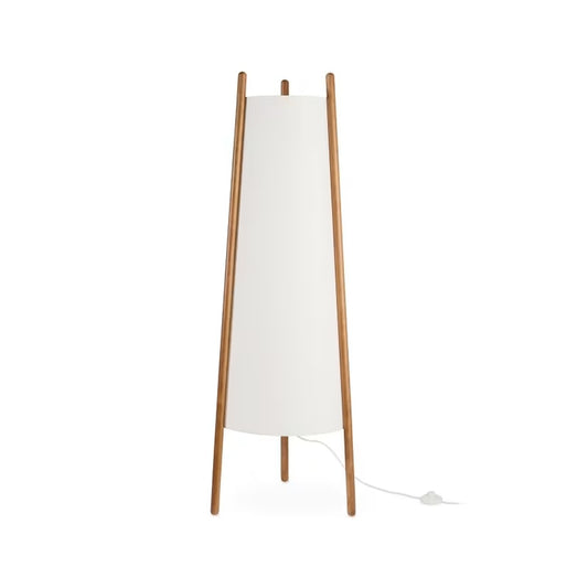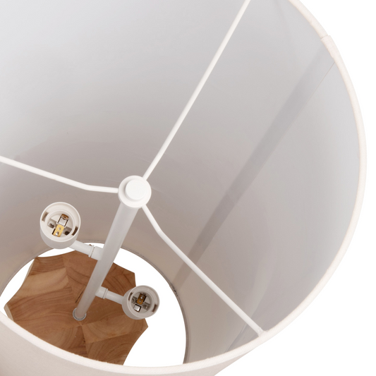 Lampadaire Japandi trépied en bois de manguier et abat-jour en lin beige H150