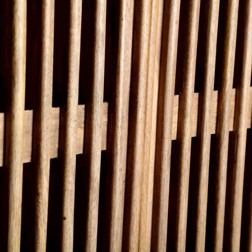 L'armoire Japandi Soren en bois de manguier marie fonctionnalité et élégance minimaliste pour un rangement optimal. Avec ses portes à lattes supérieures et son design épuré, elle s'intègre parfaitement dans un décor japandi équilibré tout en offrant un espace généreux pour vos essentiels.