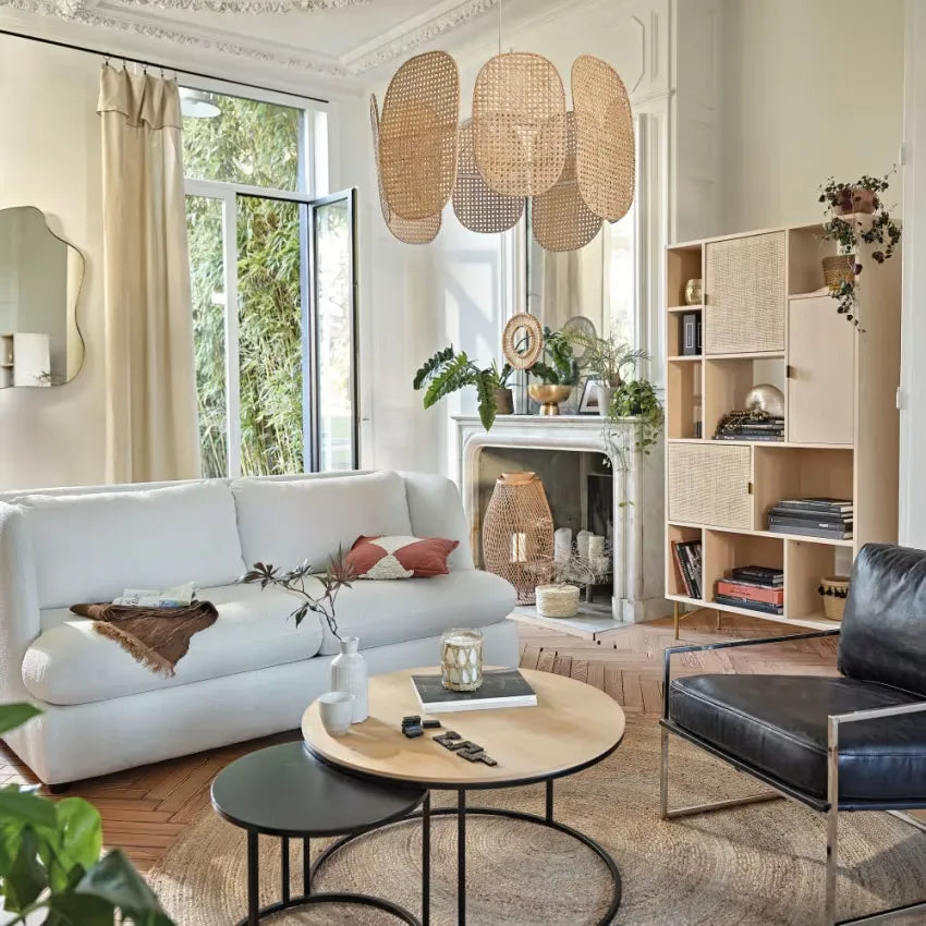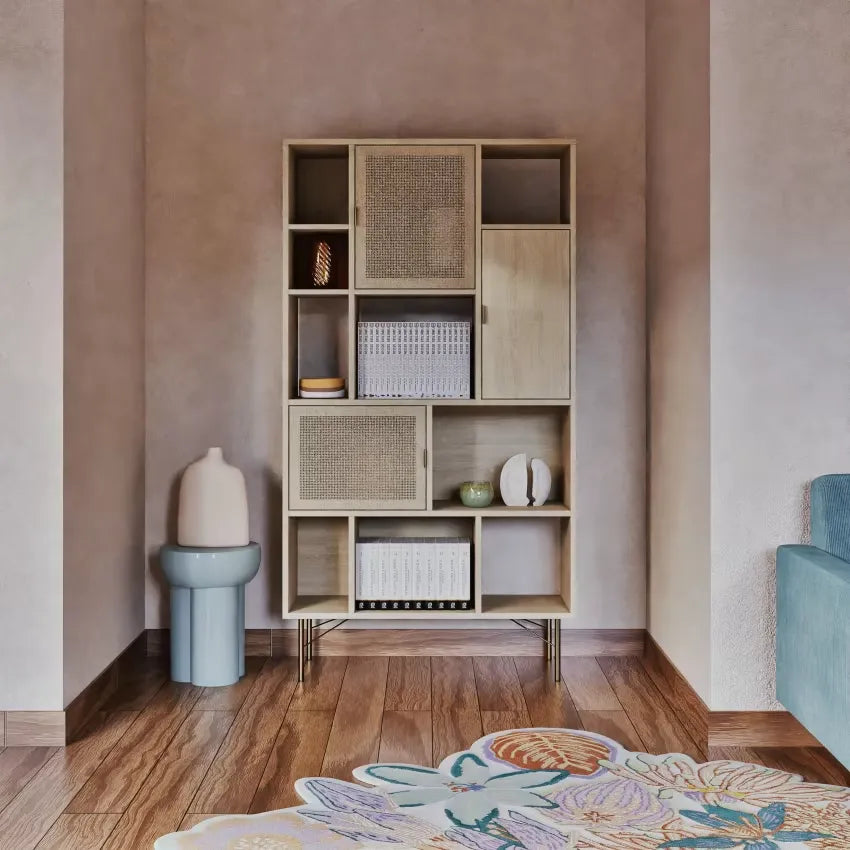 L'élégance asymétrique rencontre la fonctionnalité avec notre bibliothèque Japandi déstructurée. Son design unique allie le bois clair certifié FSC™ et le cannage en rotin pour une pièce maîtresse qui complète parfaitement vos autres meubles de rangement design.