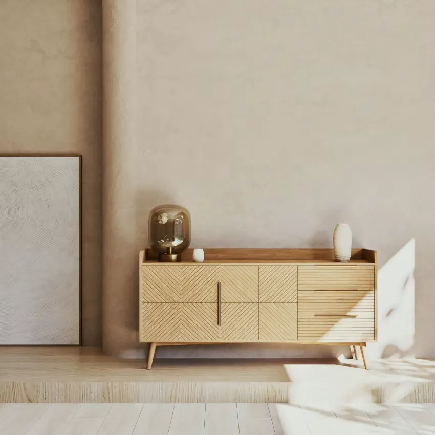 Optimisez votre espace avec ce buffet Japandi alliant esthétique vintage et fonctionnalité moderne. Un choix parfait pour un intérieur harmonieux.