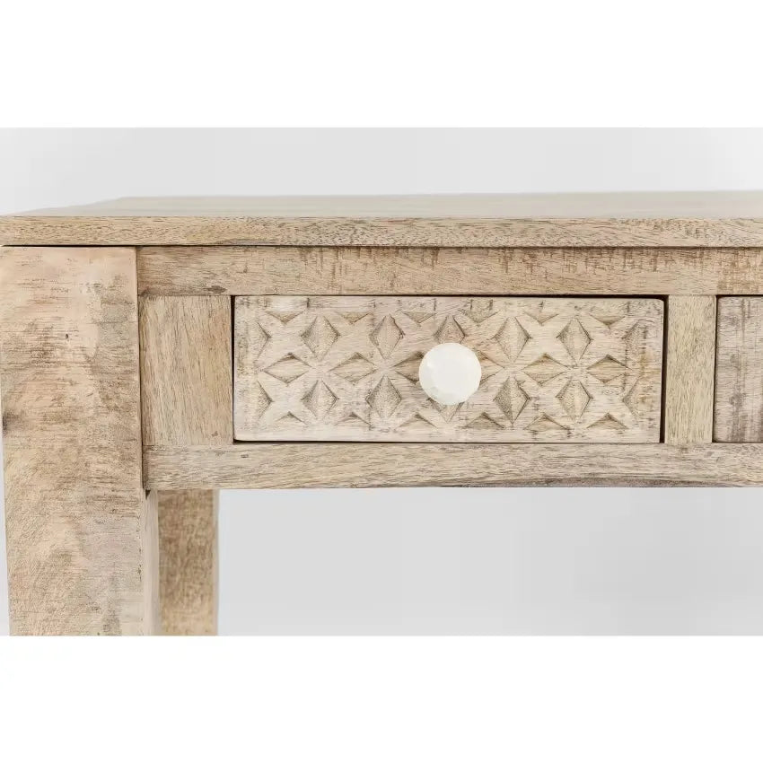 La structure robuste et durable du bois de manguier garantit une stabilité exceptionnelle et une résistance au quotidien. Les nuances chaudes du bois naturel et les finitions artisanales de chaque tiroir font de ce bureau une pièce unique qui s'intègre parfaitement dans un intérieur recherchant l'harmonie et l'authenticité.