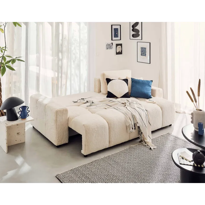 Sublimez votre intérieur avec ce canapé convertible alliant élégance minimaliste et confort optimal. Sa fausse fourrure beige apporte une dimension chaleureuse à votre espace de vie. Complétez votre aménagement salon japandi avec cette pièce maîtresse réversible.