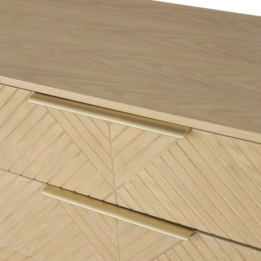 Sa silhouette minimaliste raffinée repose sur quatre pieds légèrement évasés offrant une stabilité optimale. Les façades texturées aux lignes diagonales croisées apportent un caractère unique, tandis que les poignées horizontales en métal effet laiton subliment l'ensemble avec une touche contemporaine.