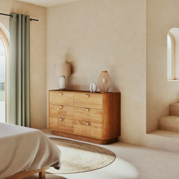 Ses six tiroirs spacieux offrent un rangement généreux pour vos essentiels, tandis que les façades délicatement gravées créent un jeu de textures subtiles caractéristique du style japonais-scandinave. Le bois de manguier massif sélectionné pour sa durabilité et ses veines naturelles uniques confère chaleur et authenticité à cette pièce.