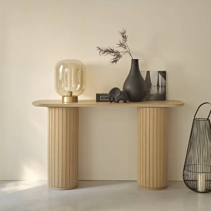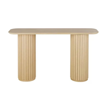Son plateau en chêne authentique repose sur deux piliers cylindriques finement travaillés. La teinte beige mate confère une atmosphère zen à votre intérieur tout en s'harmonisant avec divers styles décoratifs. Ce meuble polyvalent s'adapte aussi bien dans un couloir élégant qu'en table d'appoint dans un salon contemporain.