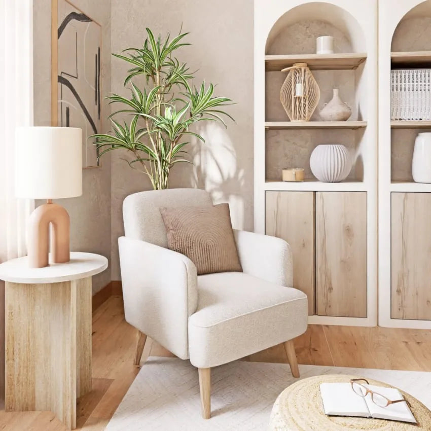 Découvrez le fauteuil en bouclette blanche et hêtre, alliant confort scandinave et élégance japonaise pour un intérieur harmonieux.