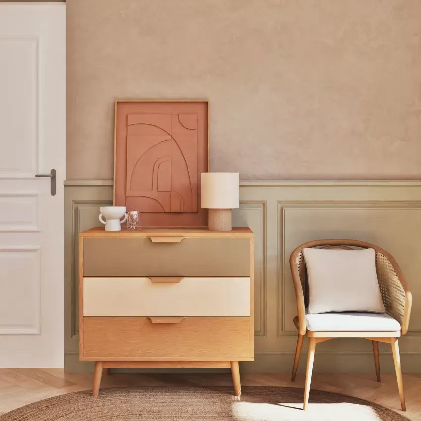 Le rotin tressé de son pied cylindrique révèle un savoir-faire minutieux, tandis que l'abat-jour en polyester recyclé beige diffuse une lumière douce et enveloppante. Cette combinaison de matériaux naturels et éco-responsables incarne parfaitement la philosophie japandi : beauté fonctionnelle et respect de l'environnement.