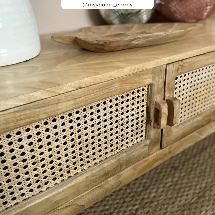 Ce meuble TV Japandi offre une fusion élégante de cannage et bois de manguier, parfait pour un intérieur apaisant et raffiné.