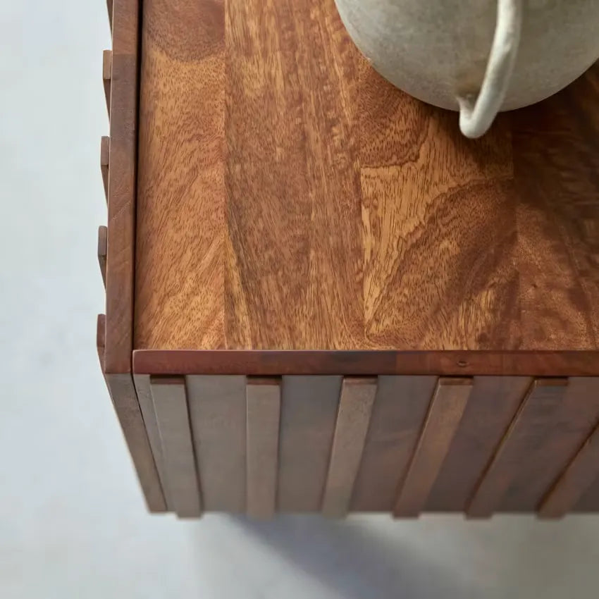 Le meuble TV Japandi Milo conjugue élégance et fonctionnalité avec son design lamellé distinctif. Sa structure en manguier massif de 140 cm offre un espace d'organisation idéal pour tout votre équipement multimédia. Complétez votre intérieur avec nos autres pièces de mobilier pour salon au style épuré.