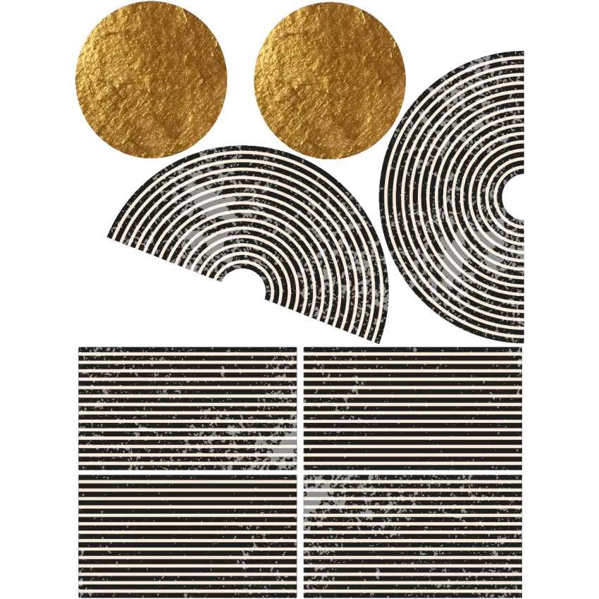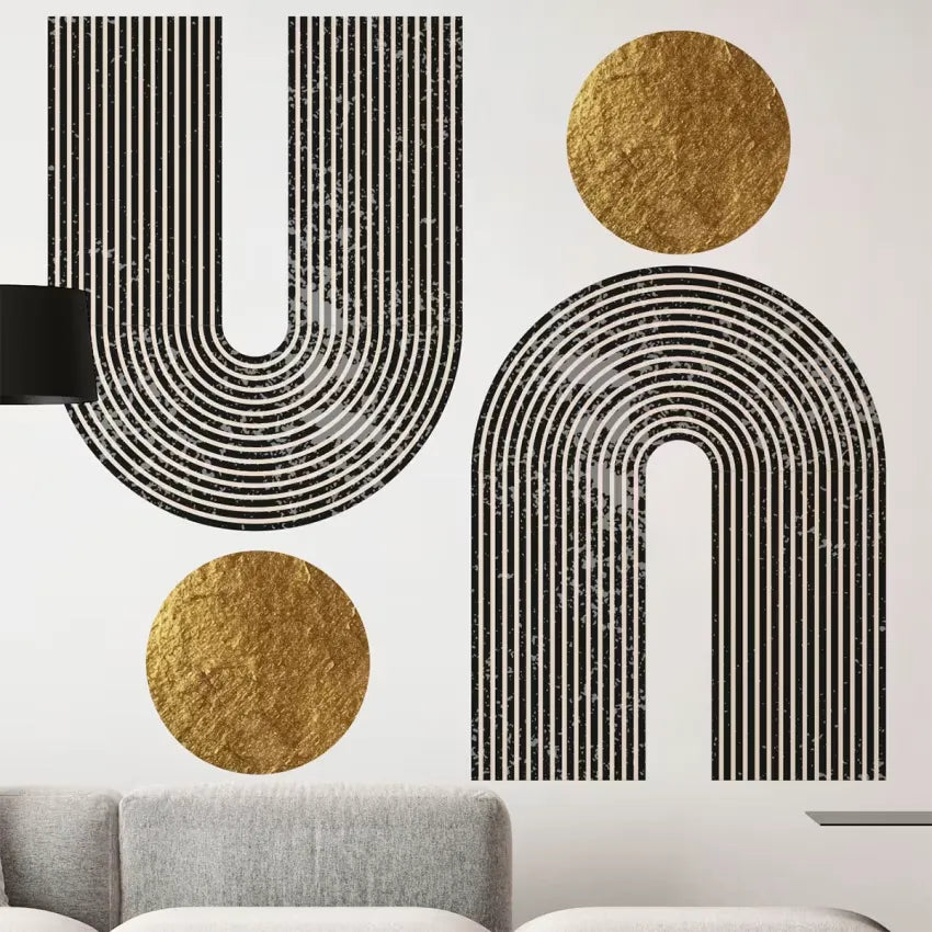 Ce papier peint décoratif constitue un véritable élément architectural pour vos espaces. Les arches abstraites et cercles dorés créent une composition visuelle saisissante, idéale pour accompagner vos meubles en bois clair et accessoires minimalistes caractéristiques du style japonais-scandinave.