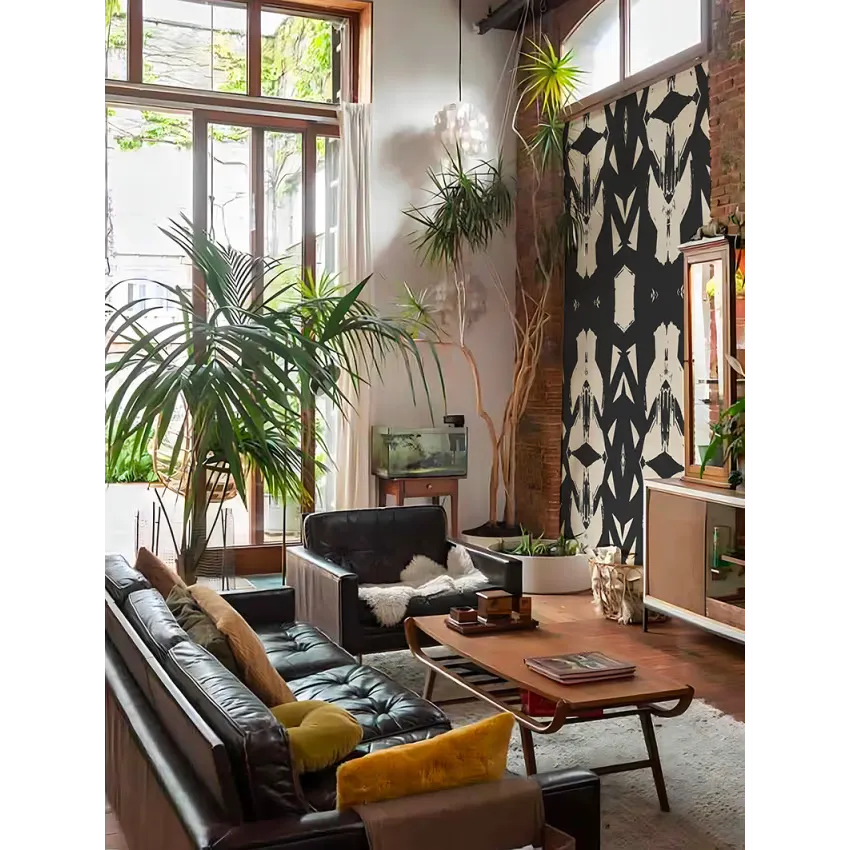 Les influences tribales stylisées de ce papier peint s'inscrivent parfaitement dans la philosophie Japandi qui valorise l'artisanat et les traditions culturelles. Sa dimension généreuse de 300x300 cm permet de couvrir un pan de mur entier, créant un effet immersif qui transforme radicalement la perception de votre pièce. Les designers d'intérieur recommandent de l'associer à des matériaux bruts comme le bois clair ou la céramique pour amplifier son caractère authentique.
