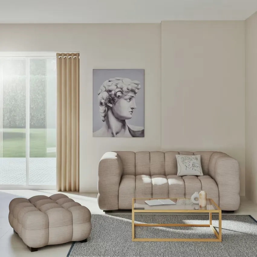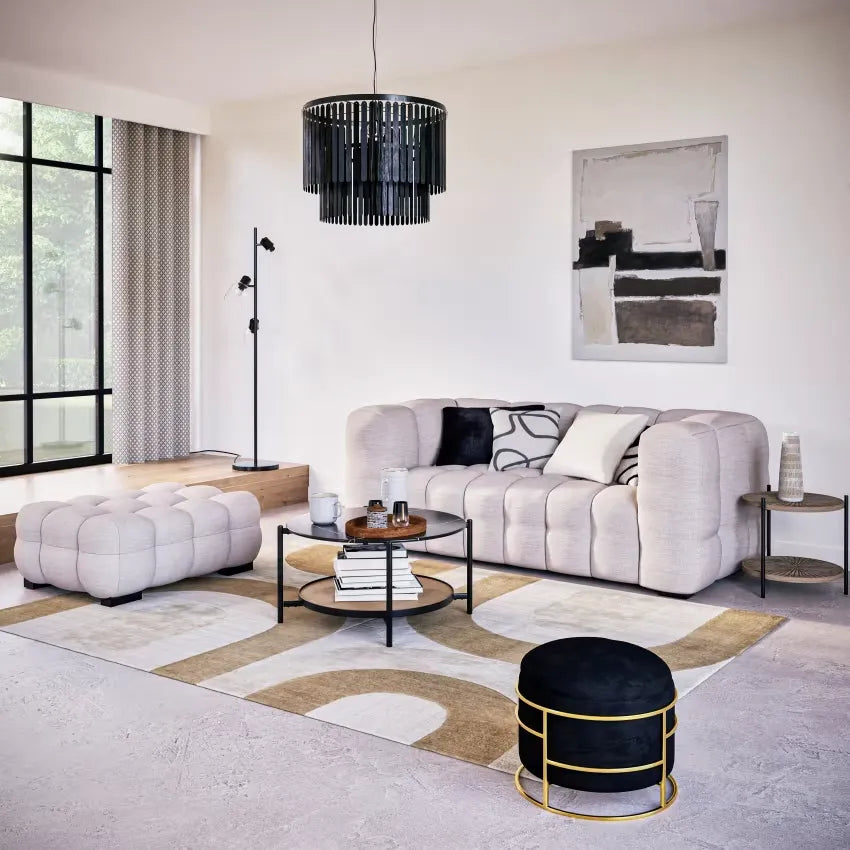 La finition capitonnée du tissu beige sable crée un jeu de textures élégant qui capture l'essence du style japandi. Son rembourrage généreux garantit une expérience d'assise moelleuse, tandis que ses pieds discrets assurent stabilité et durabilité, pour un meuble qui traversera les années sans perdre son charme.