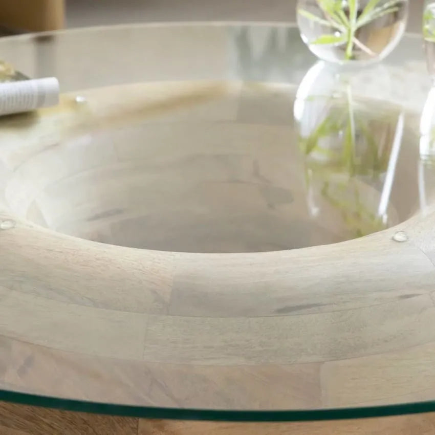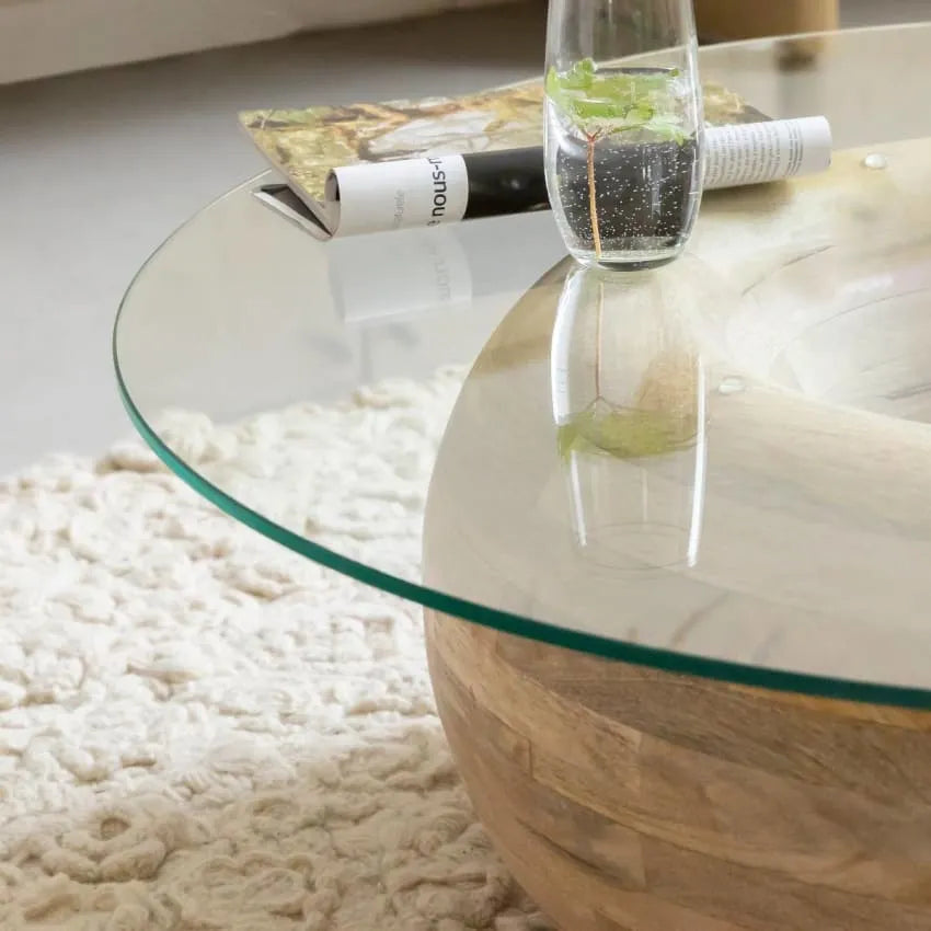 Les artisans ébénistes ont minutieusement travaillé chaque élément pour garantir une durabilité exceptionnelle sans sacrifier l'esthétique. Le contraste entre le verre transparent et la texture chaleureuse du bois crée une dynamique visuelle qui capte la lumière naturelle, illuminant votre pièce tout au long de la journée. Nous recommandons de l'associer à nos coussins décoratifs aux tons neutres pour parfaire l'ambiance zen de votre espace de vie.