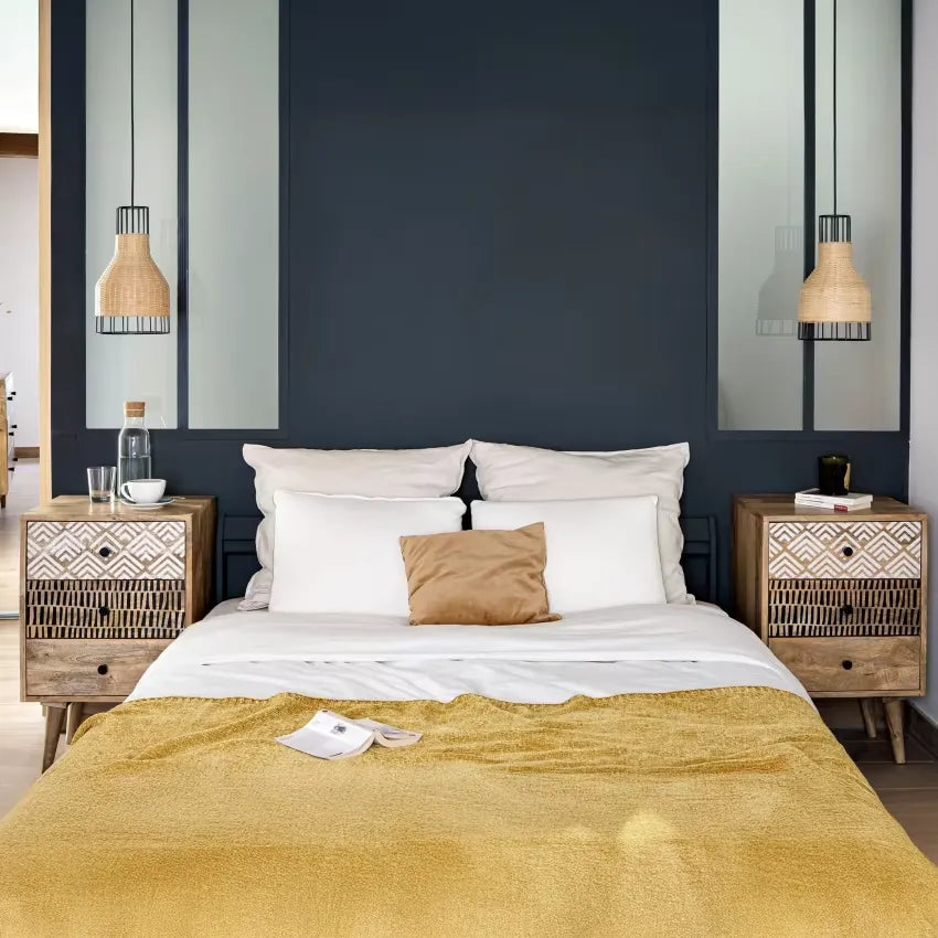 La table de nuit Tali illustre l'essence même du style Japandi avec son mélange parfait entre fonctionnalité nordique et esthétique japonaise. Ses motifs géométriques contrastés créent un équilibre visuel subtil qui capte l'attention sans dominer l'espace, caractéristique fondamentale de ce courant décoratif en pleine expansion.