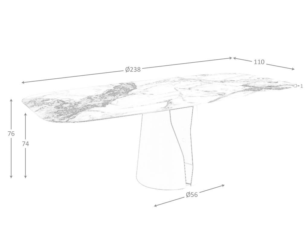 Le plateau biseauté de 240 x 110 cm offre un espace généreux pour accueillir jusqu'à 10 convives dans un confort optimal. La finition brillante du marbre porcelaine capte délicatement la lumière, tandis que les pieds sculptés en acier blanc créent une assise solide au design architectural saisissant.