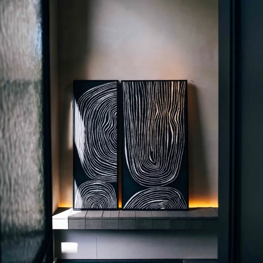 Transformez votre intérieur avec cette toile artistique qui capture l'essence du design Japandi. Son diptyque élégant aux motifs organiques en lignes blanches sur fond sombre apportera une touche contemplative à votre espace. Explorez notre collection complète de décorations murales Japandi pour harmoniser votre intérieur.