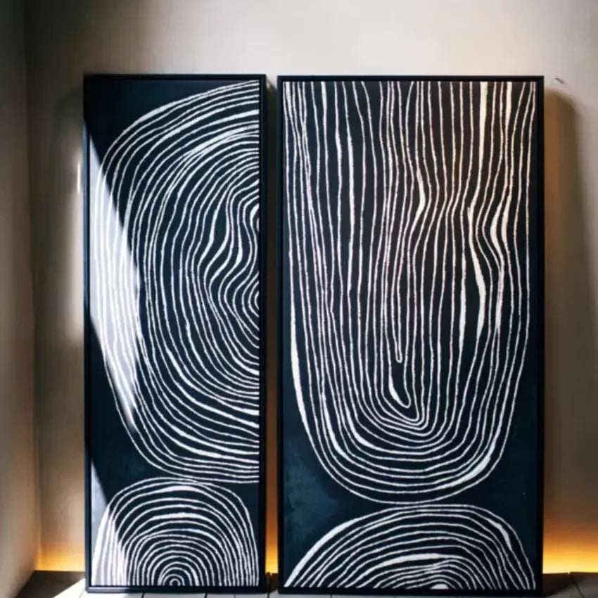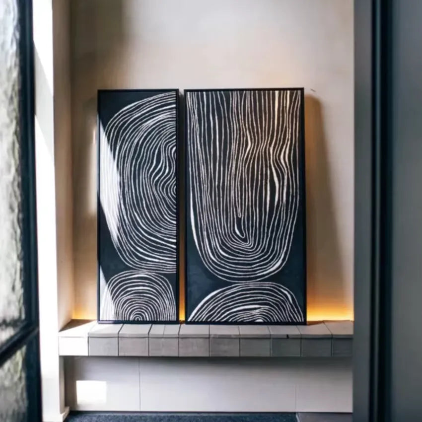 Les deux panneaux verticaux de la Toile Japandi Cadre Noir – Sestri II créent un dialogue visuel captivant entre les courbes concentriques et les lignes sinueuses. Encadrée d'un cadre noir minimaliste, cette œuvre de 63 x 123 cm s'intègre parfaitement dans un salon contemporain, une chambre zen ou un espace de travail.