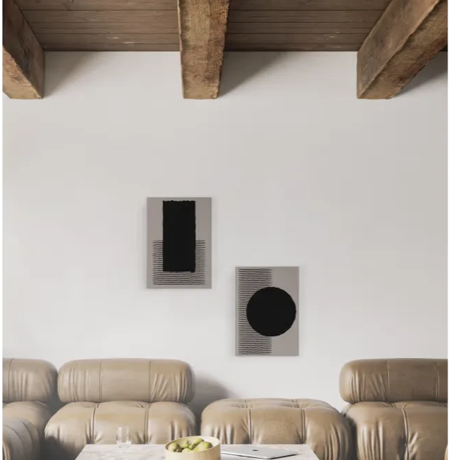 Cette œuvre graphique contemporaine capture l'essence même de la philosophie japandi : simplicité, équilibre et harmonie. Ses tons neutres et son motif noir audacieux créent un contraste saisissant qui attire le regard tout en préservant une atmosphère zen caractéristique des intérieurs épurés.